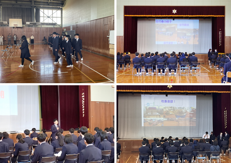 後半の行事紹介では、生徒会執行部の楽しい進行で会場に笑顔が広がりました。続く部局紹介では、各部が工夫を凝らした動画やパフォーマンスを披露。魅力を全力で伝えようとする先輩たちの姿を、新入生も真剣な眼差しで見つめていました。
